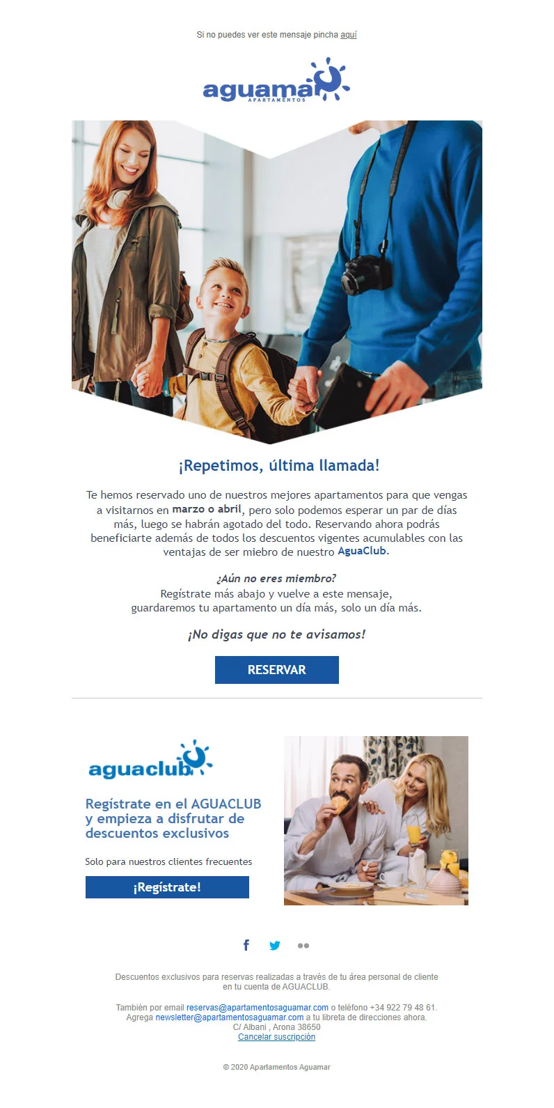 Para mantener una comunicación constante con sus huéspedes, Apartamentos Aguamar hace el envío de una newsletter mensual con promociones especiales y con información relevante para sus clientes. En cada newsletter se respeta la línea gráfica de comunicación pero se diferencia un envío del otro por el mensaje que personalmente redacto bajo unas pequeñas directrices y las fotografías con distintos diseños que propongo utilizar.